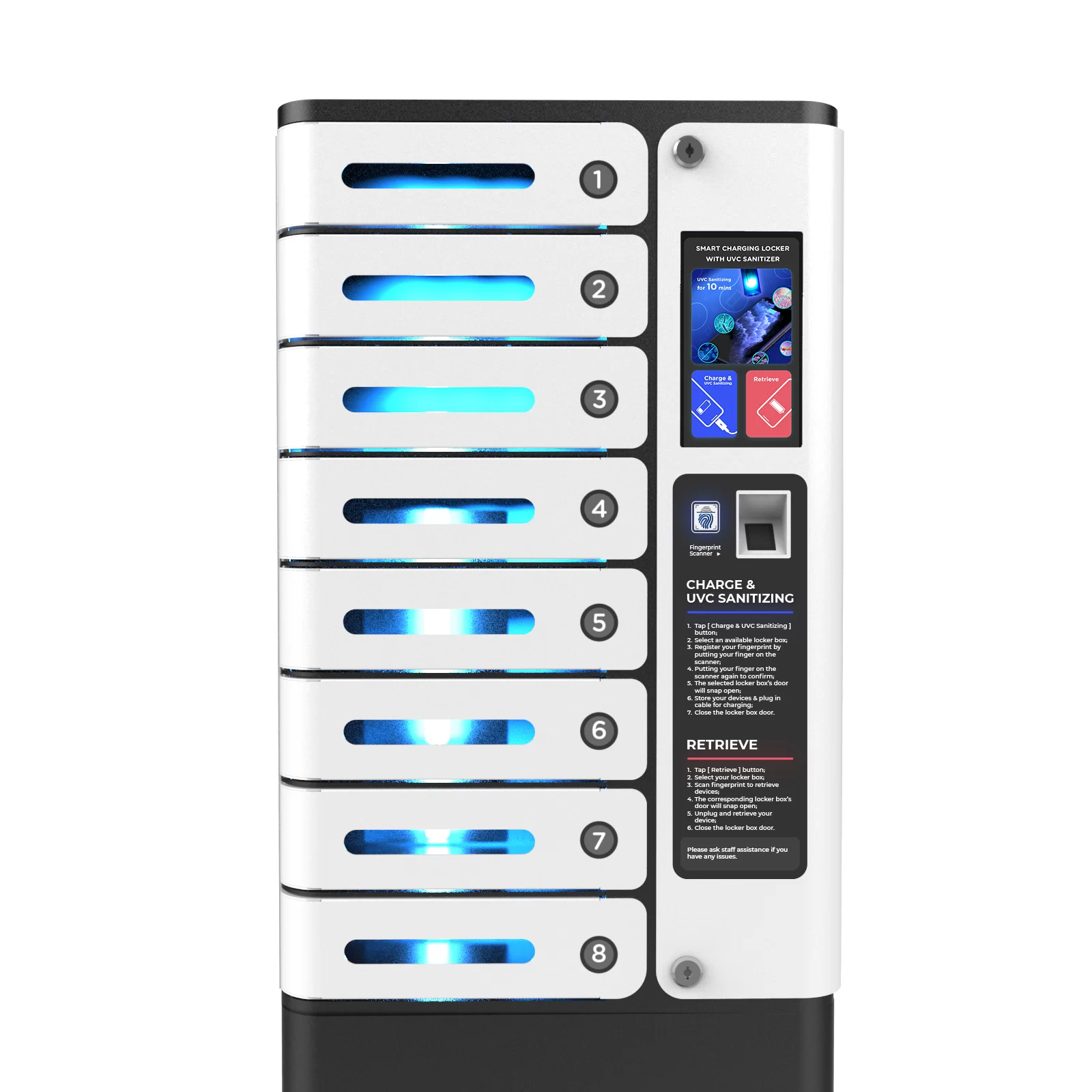 We are happy to introduce our new Fingerprint Locking System bepoke designed for our line of popular UV-C Sanitising & Charging Lockers for Portable Devices.